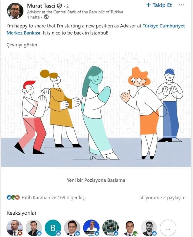 TCMB’nin yeni danışmanı Murat Taşçı, göreve başladığını profesyonel iş ağı LinkedIn üzerinden duyurdu.